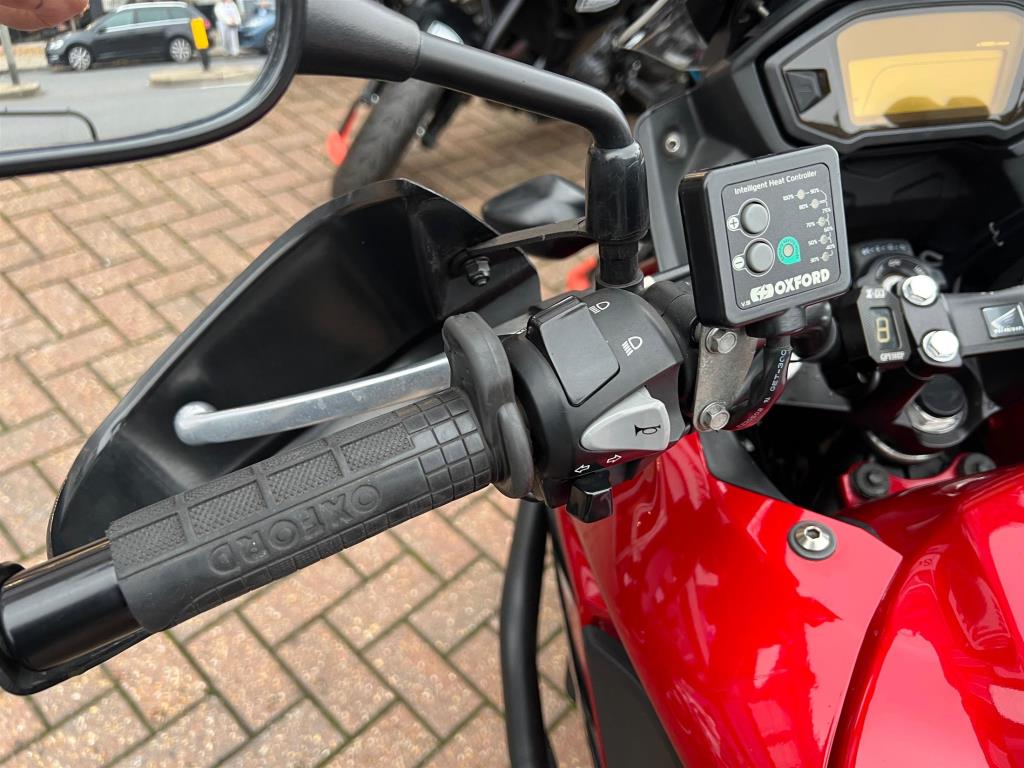 Accessories include tall screen, crash bars, heated grips, gear indicator.